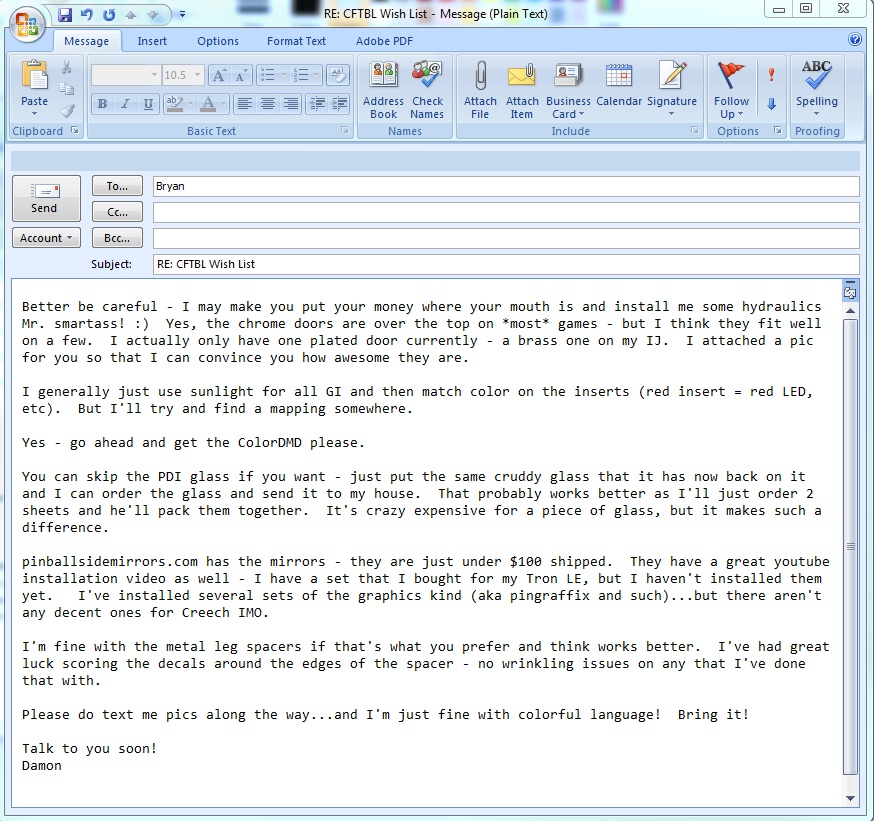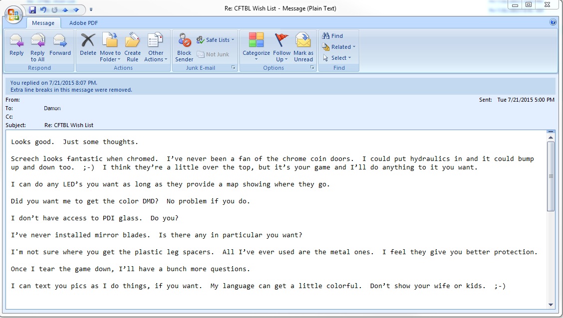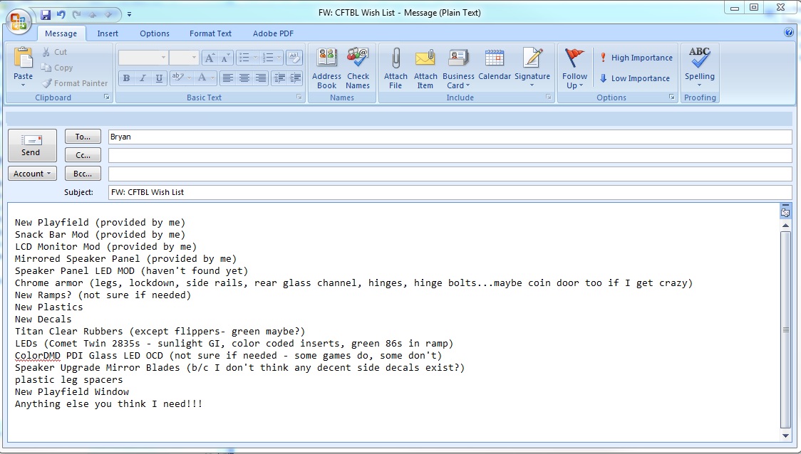 The LCD mod is packed under the playfield - the snack bar mod has been shipped to you...playfield and speaker panel will be shipped to you soon. I'll email you my wish list here in a few minutes